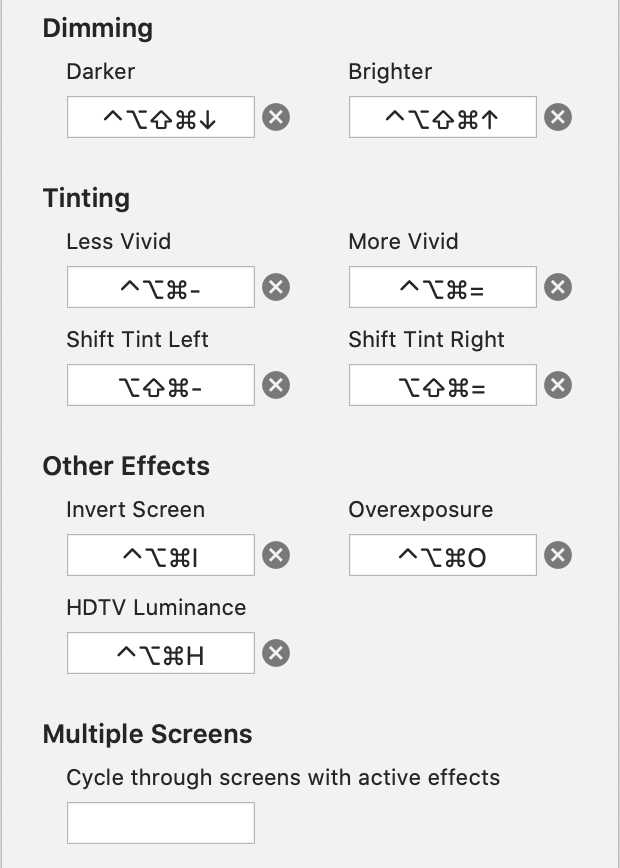 If you have more than one monitor, you can apply the same effect on all of them or apply a different effect to each. In the former case hot keys will control the effect for all the screens at the same time. In the later case hot keys will let you to control each screen independently, with one hot key to cycle between them.