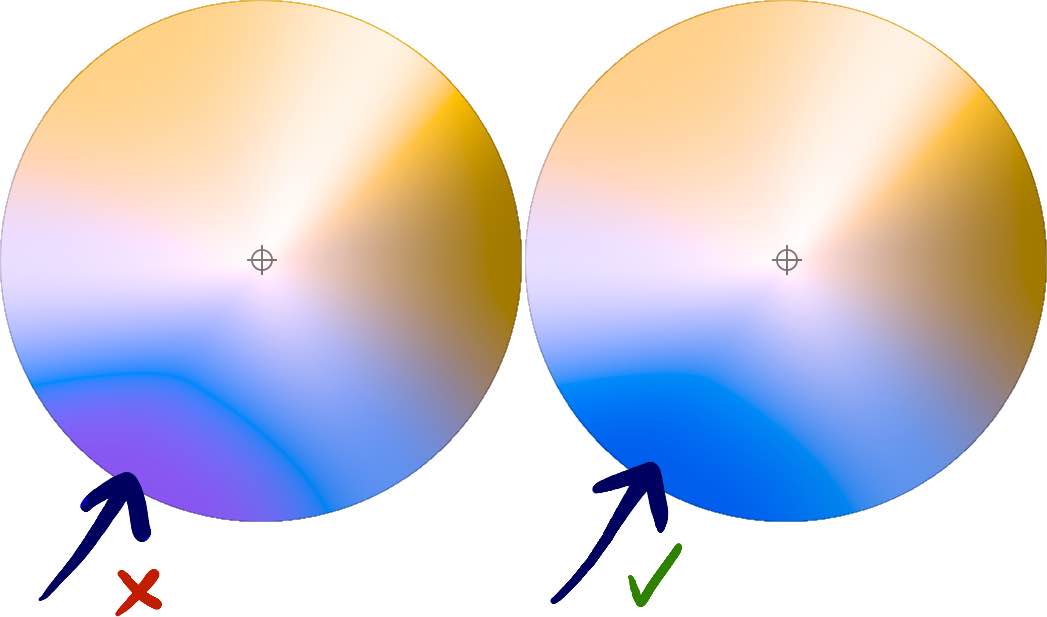 On a filtered color wheel we can observe that a region of deeply saturated blue becomes purple. This makes no visual sense: purple light is blue light + red light, and this purple area showed up even for protanopia (no red cones). This also wasn’t happening with version 1, and it wasn’t happening on the Color Laboratory on which Sim Daltonism’s filter algorithm is based.