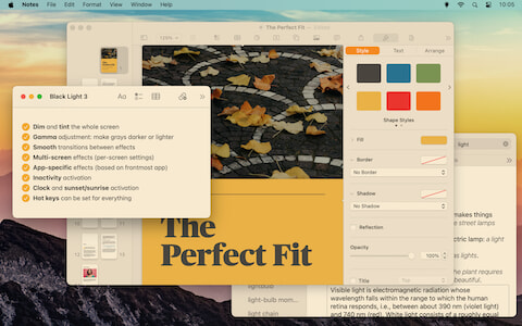 Add visual effects to your screen so your eyes can rest or for fun. Setup your effects and switch when needed with a hot key, at predetermined times, or based on the frontmost app.